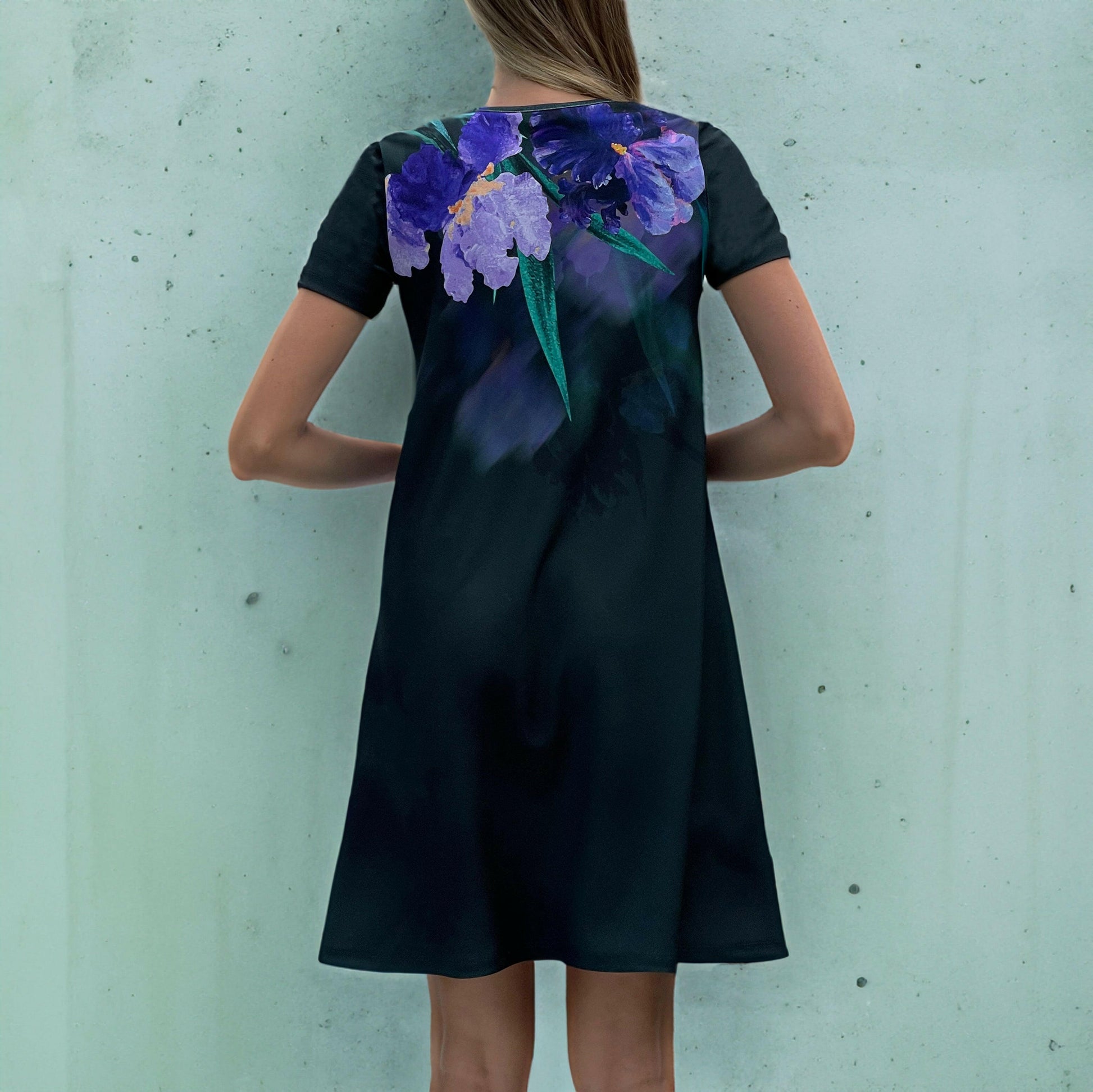 Abitino a godet in crêpe elasticizzato, in un esclusivo disegno di iris effetto dipinto su uno sfondo dal colore sfumato. L'interno dell'abito è in tinta unita lilla ed è stampato con piccoli loghi per sottolineare l'esclusività del tessuto. Scollatoa a V.La linea fluida gli dona grande vestibilità.