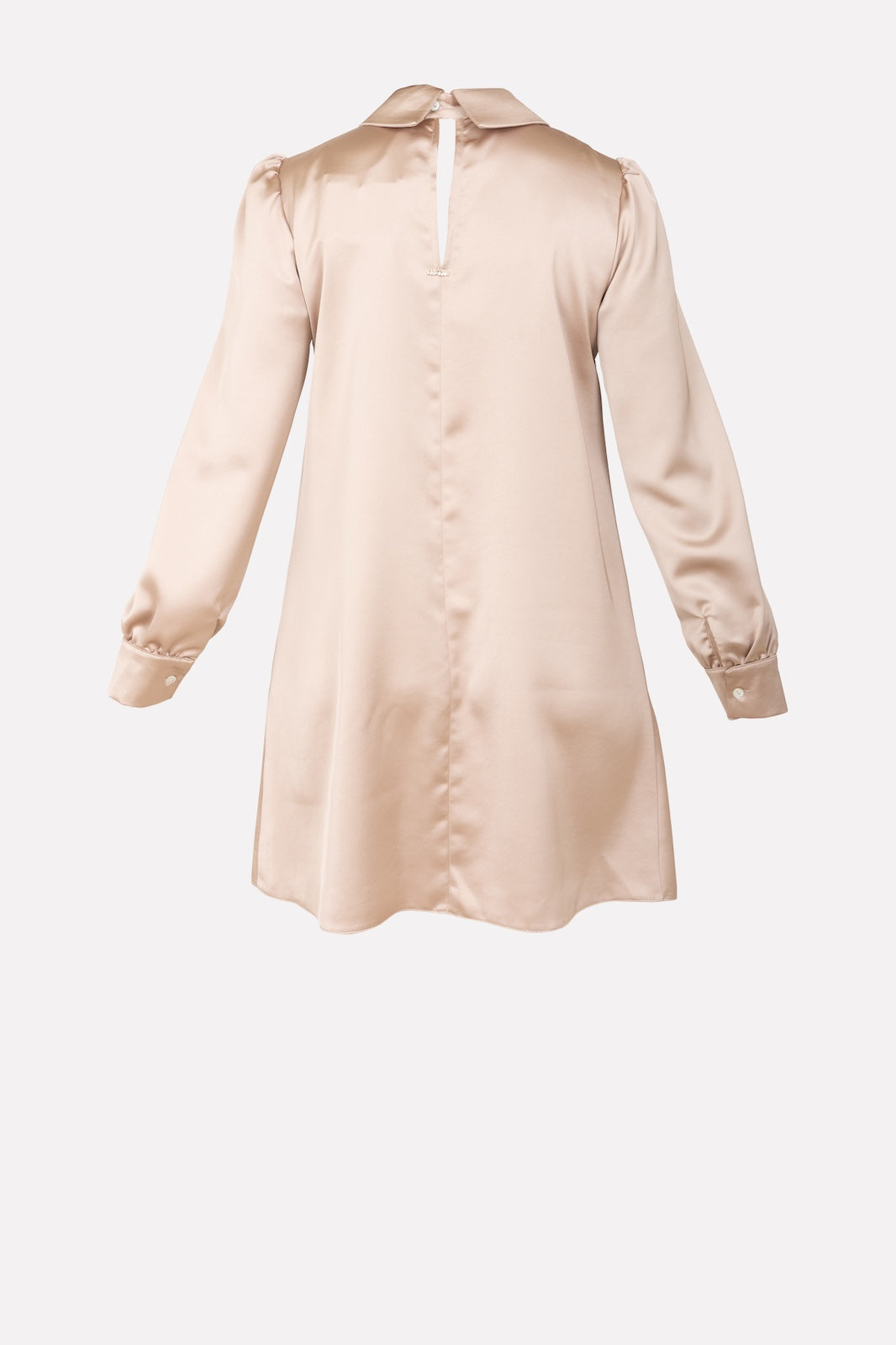 L’abito corto in raso varia la sua eleganza classica grazie all 'accessorio in oro.. removibile.. collo camicia con abbottonatura sul retro manica con polsino e bottoncino, tessuto fluido che dona movimento alle linee