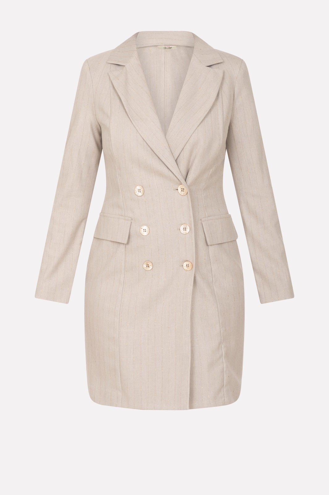 vestito blazer, tessuto leggermente elasticizzato, tinta unita gessato e righino in lurex, senza applicazioni, collo con revers, maniche lunghe, interno foderato, chiusura con bottoni, tasche con patta,
