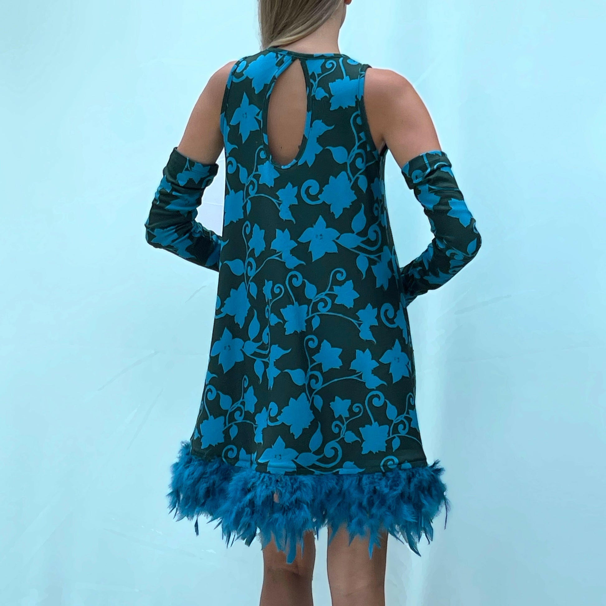 Abito a godet in maglia stampata in un esclusivo disegno floreale fondo verde bottiglia con contrasti turchese. L'interno del tessuto è in tinta unita turchese Giro manica all'americana. Aperture a goccia sul davanti. Bordato di piume in tono. Può essere indossato con i guanti dello stesso tessuto.