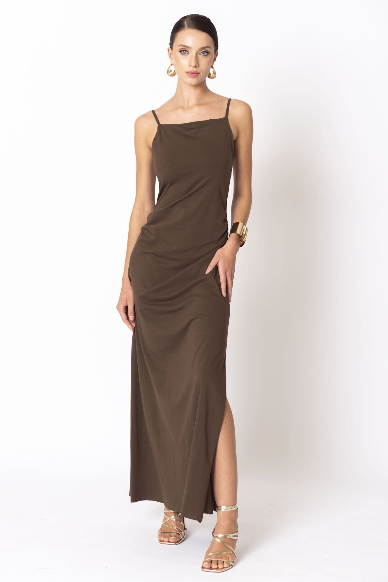 Di taglio morbido, è lungo fino alla caviglia con scollo dritto e spalline sottili regolabili arricciatura su di un fianco e spacco laterale Puoi usare quest’abito per una serata o un evento, ma lo puoi anche indossare durante il giorno per i tuoi impegni quotidiani, magari con un sandalo basso e colorato.