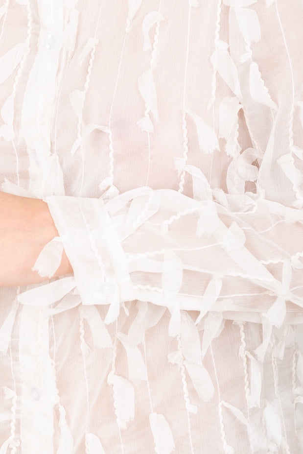 Realizzata in tulle fluido, questa camicia presenta frangine che ricoprono tutta la superfice e le maniche, creando movimento e leggerezza. Il tessuto regala una vestibilità morbida, perfetta per completare look moderni ,