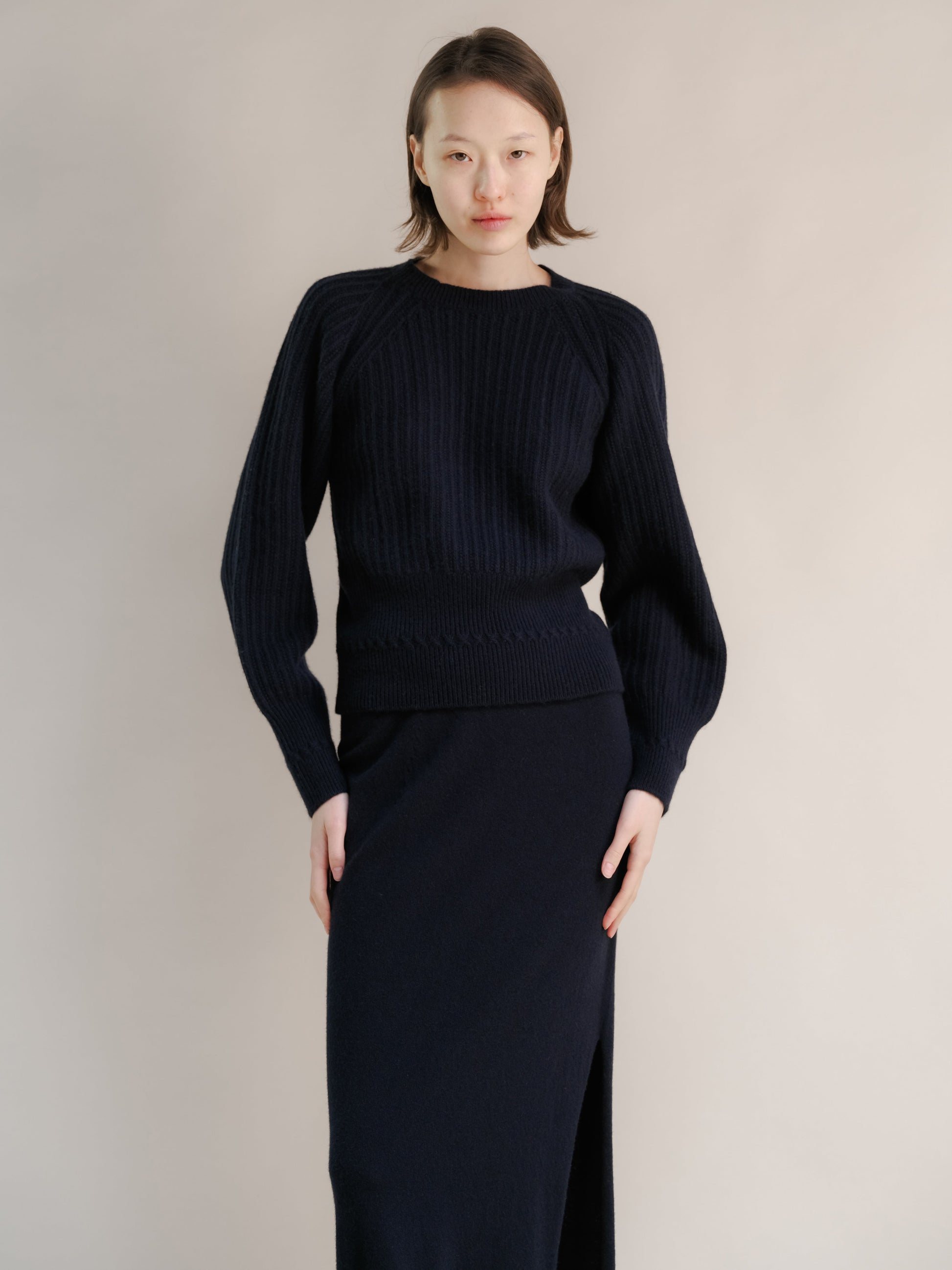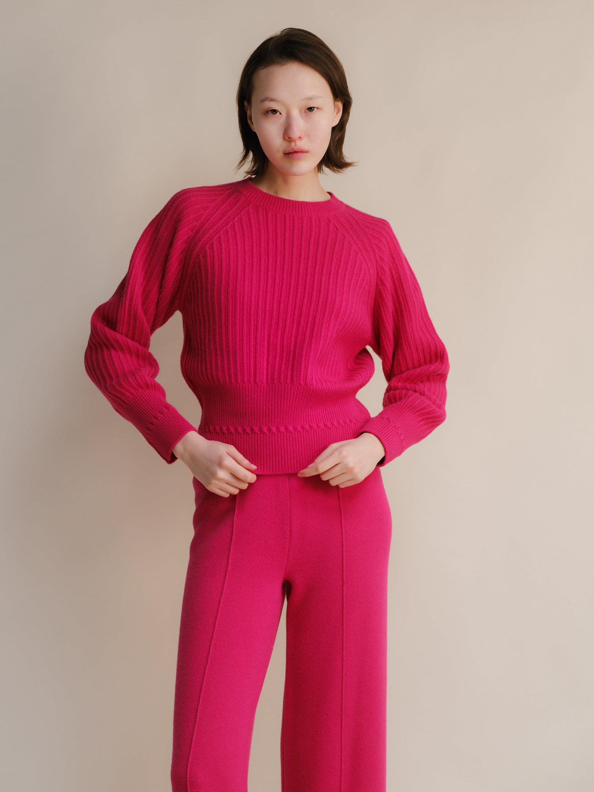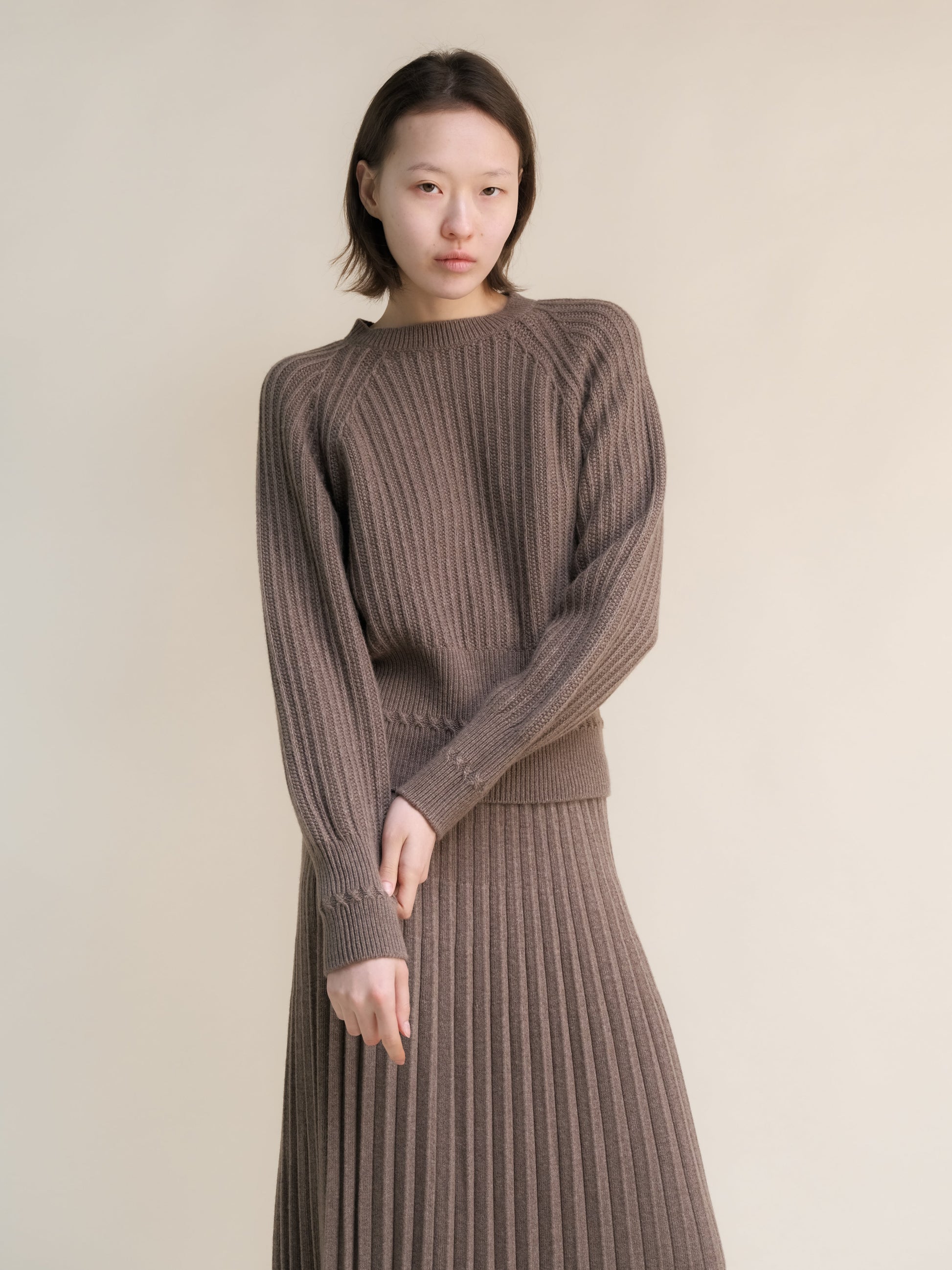 An elegant cropped crewneck sweater in a luxurious cashmere blend, entirely ribbed. The raglan sleeves and a delicate cable detail on the edges and cuffs add a touch of sophistication.