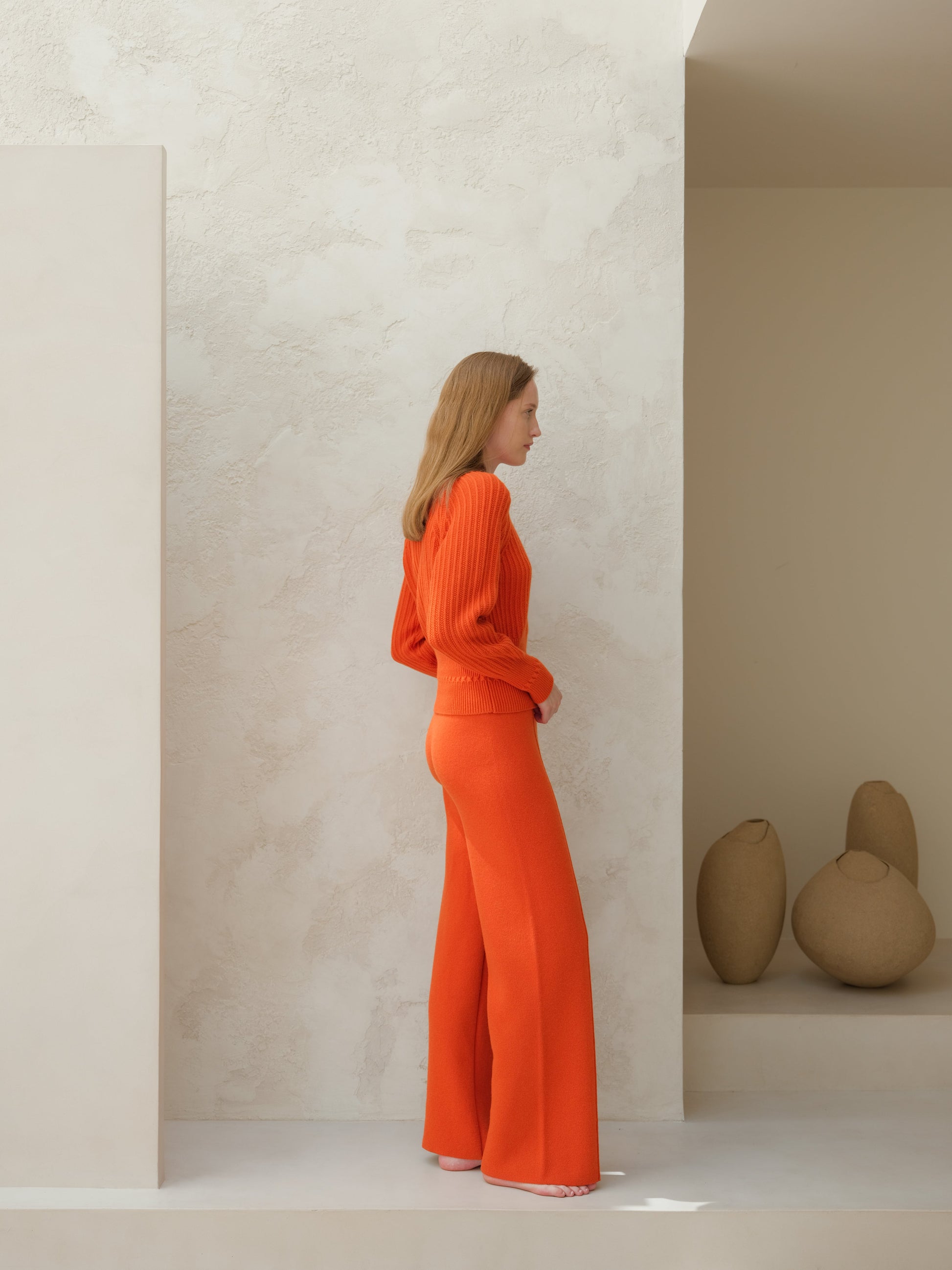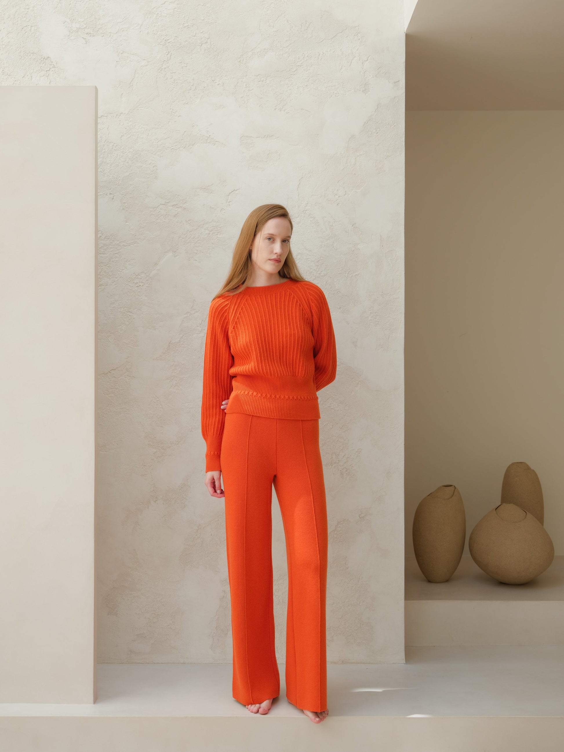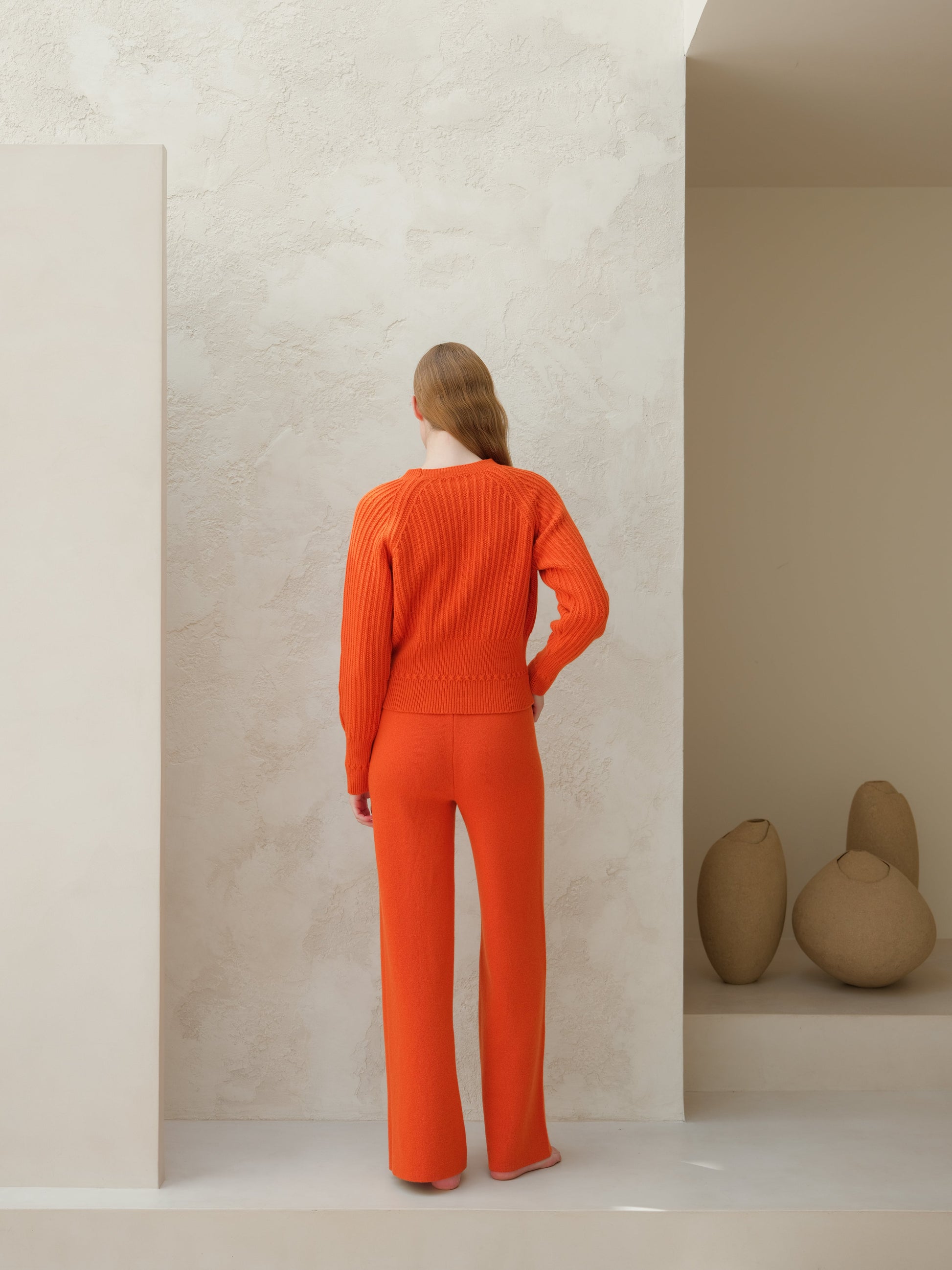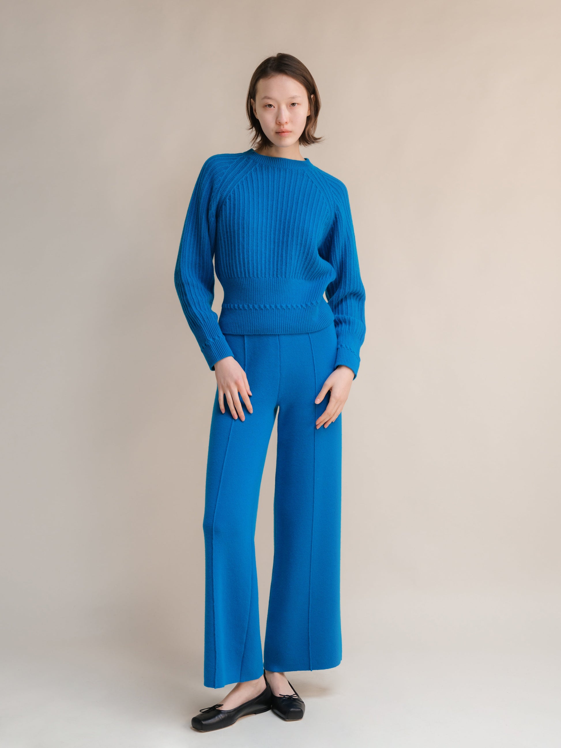 An elegant cropped crewneck sweater in a luxurious cashmere blend, entirely ribbed. The raglan sleeves and a delicate cable detail on the edges and cuffs add a touch of sophistication.