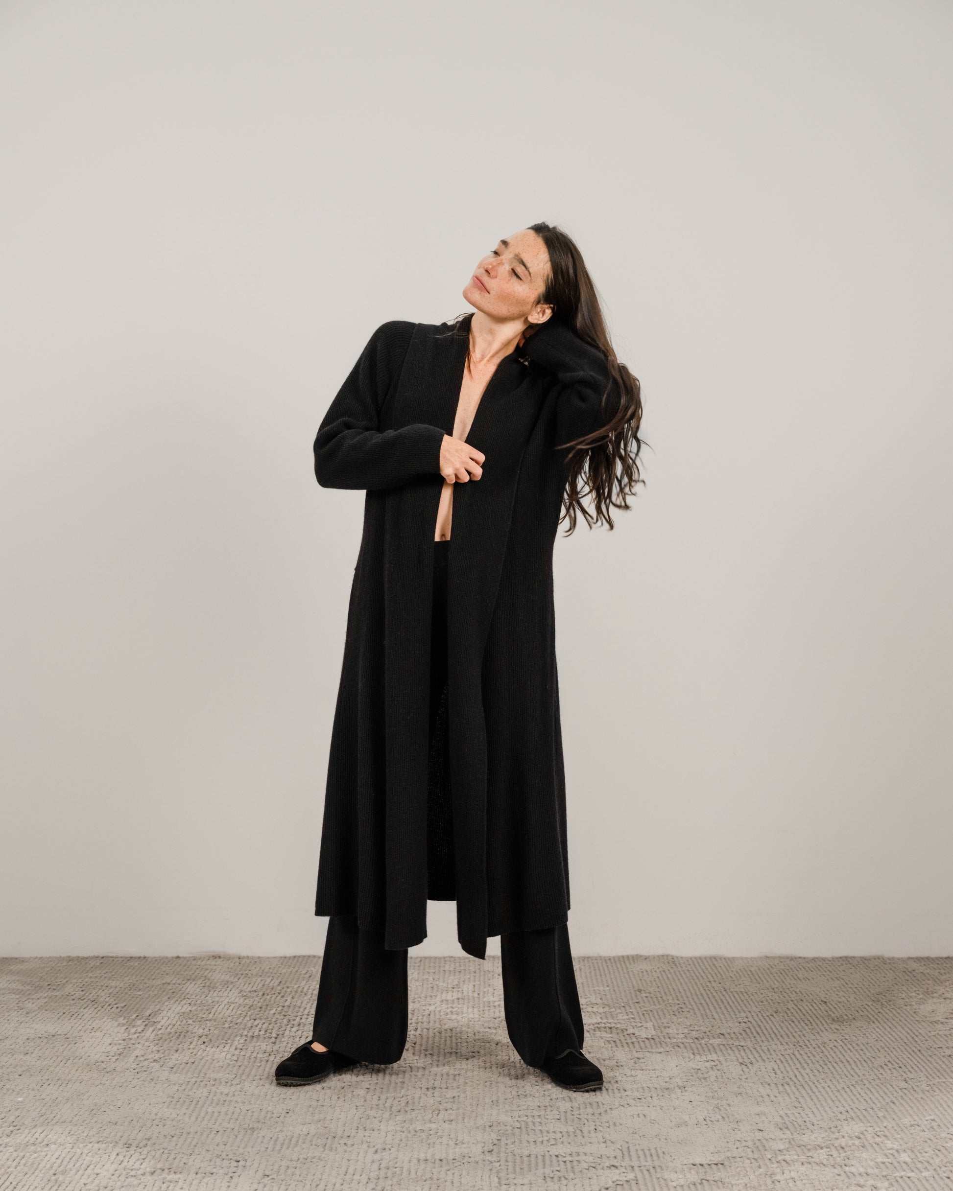 A cocooning, longline cardigan designed for elevated comfort and ease.