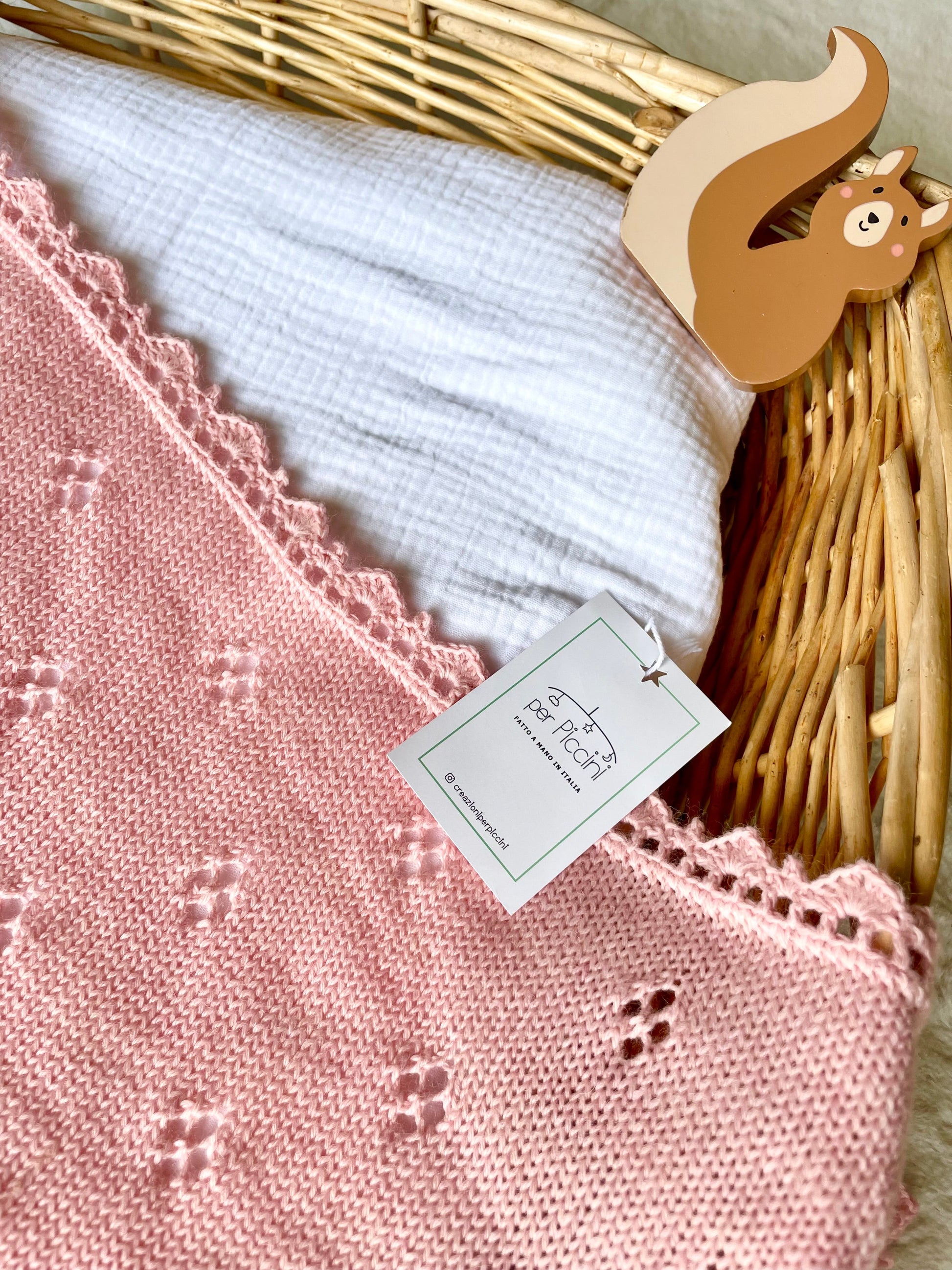Avvolgi il tuo piccino in questa morbidissima copertina in pura lana merinos extrafine con lavorazione traforata nel classico motivo pointoille e bordi rifiniti all'uncinetto. Morbida e calda, è perfetta per la culla del tuo bebè. Un tocco di dolcezza per il suo sonno che lo accompagnerà nei suoi sogni più belli.