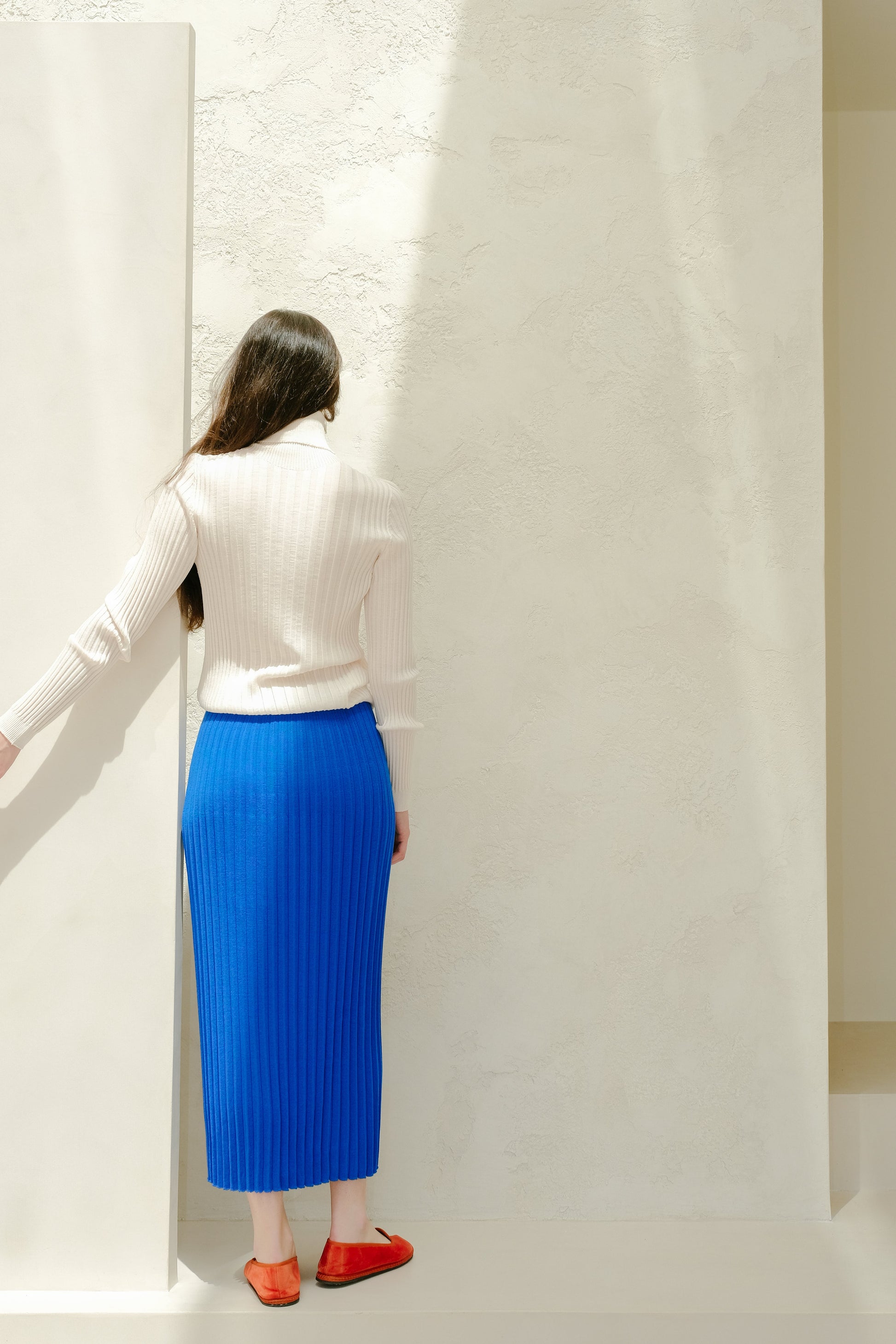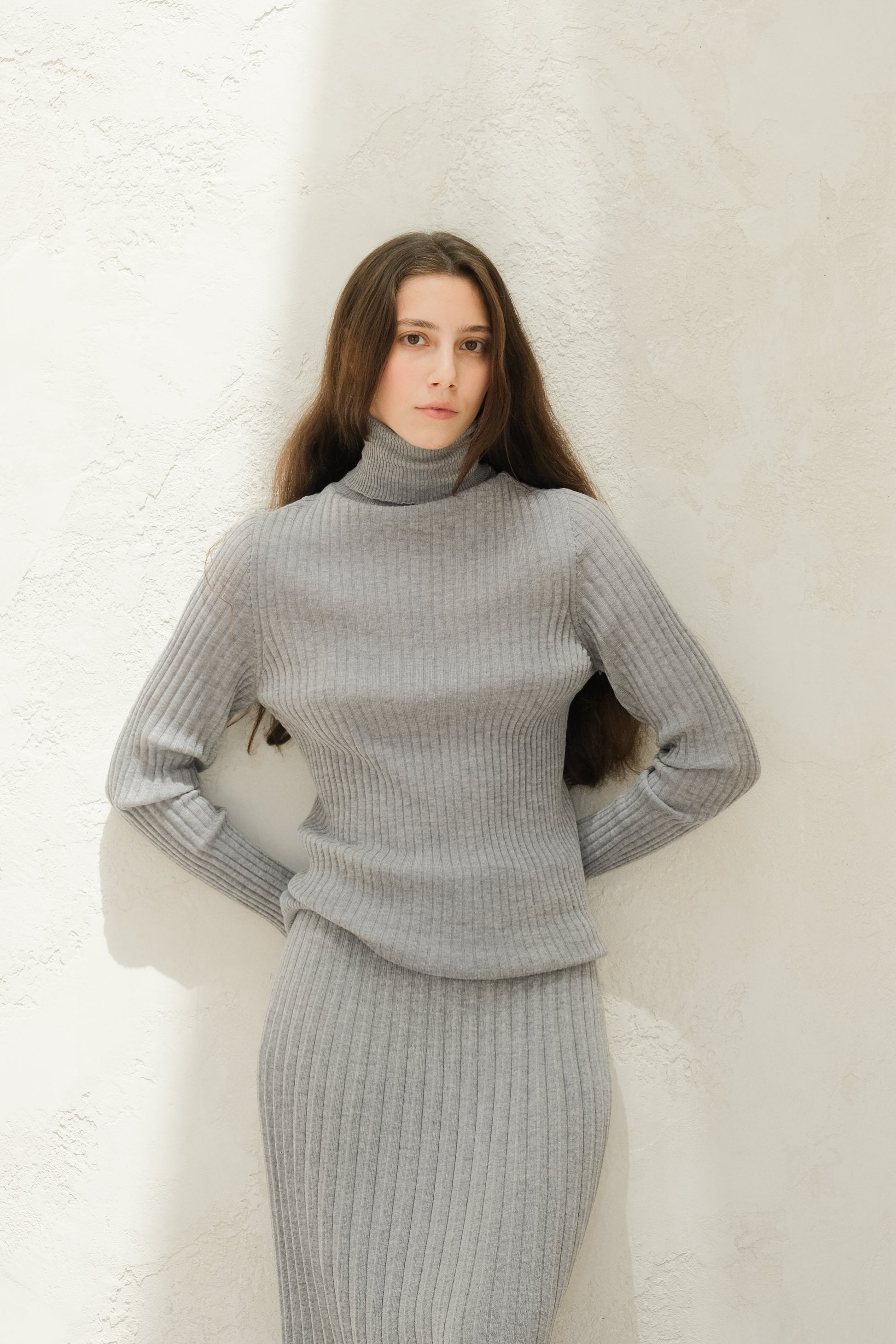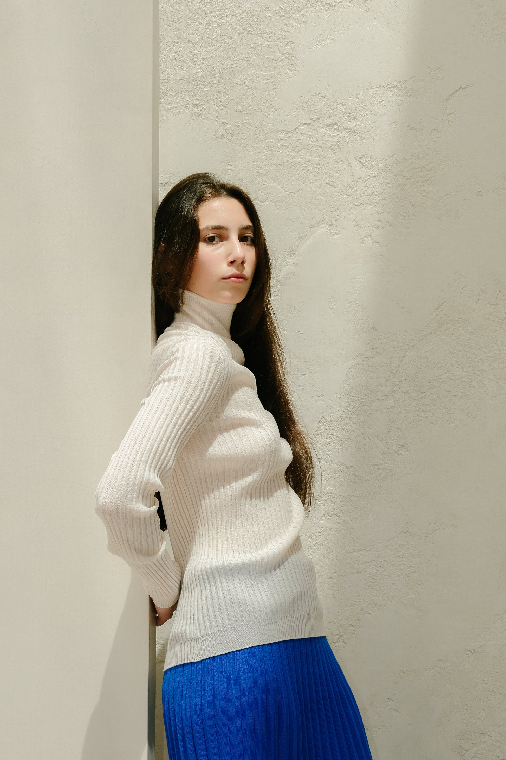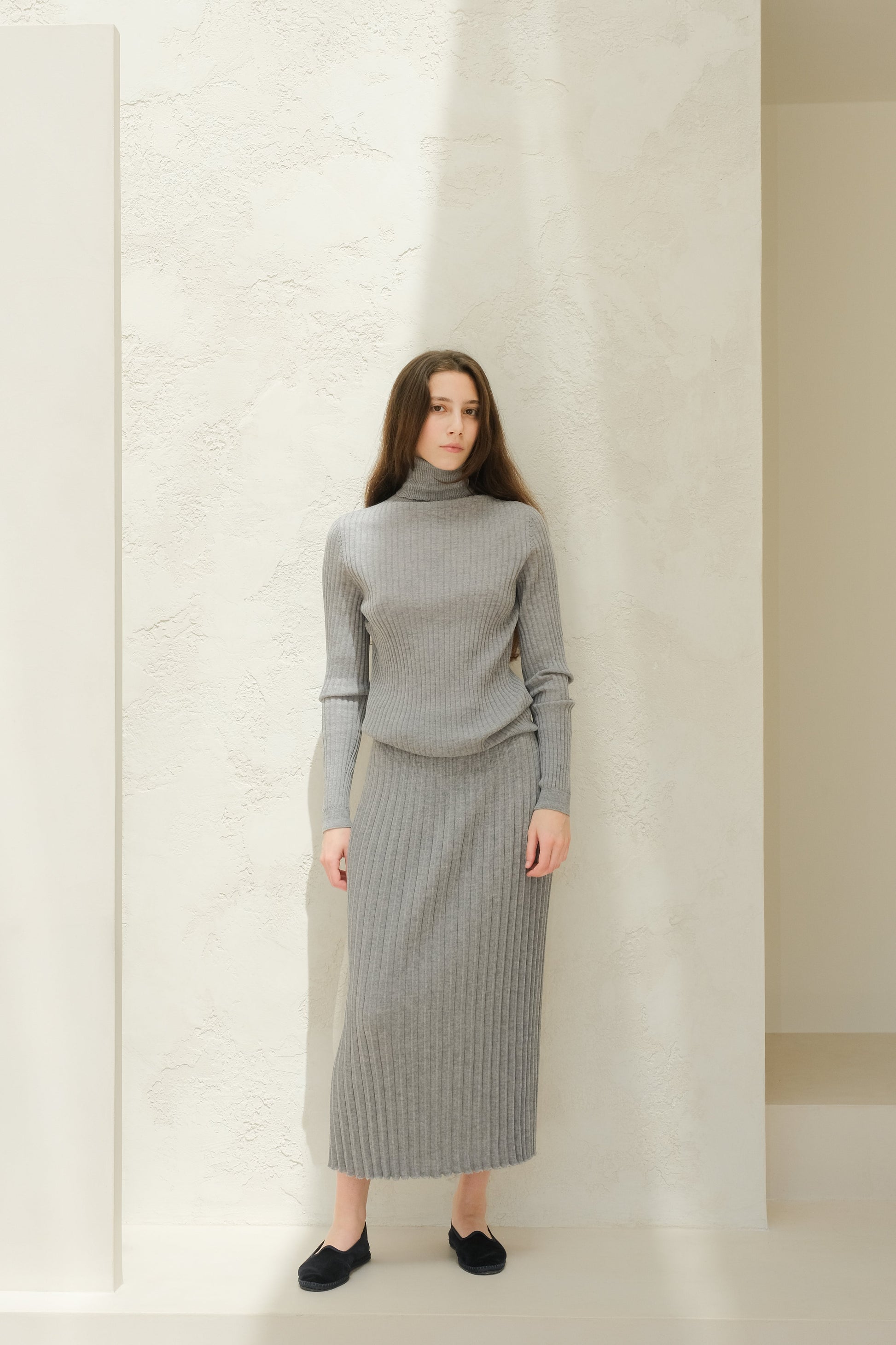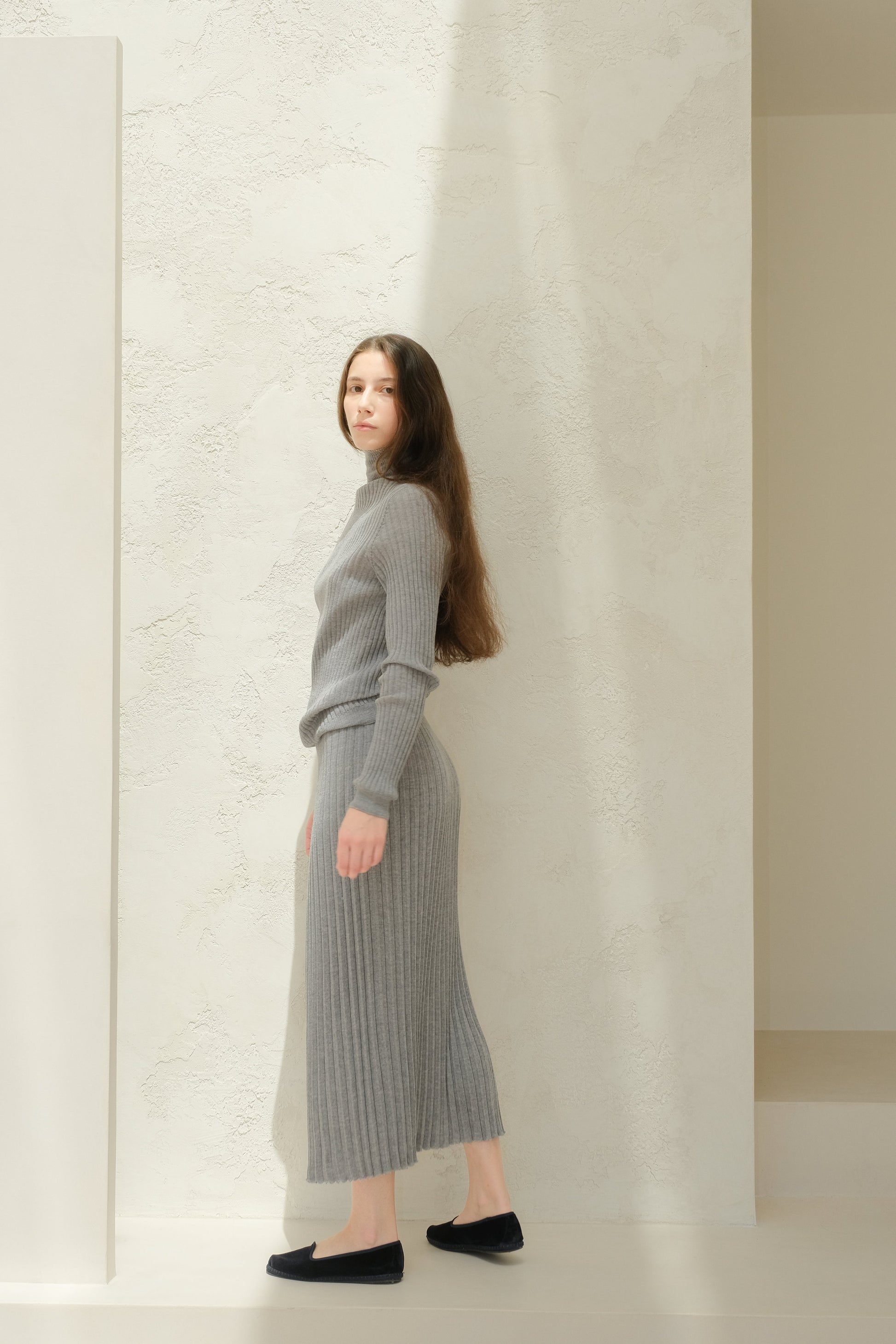 Close-fitting and soft against the skin, it offers light warmth and clean lines—ideal on its own or under layers. The varied rib texture adds a subtle, distinctive touch.