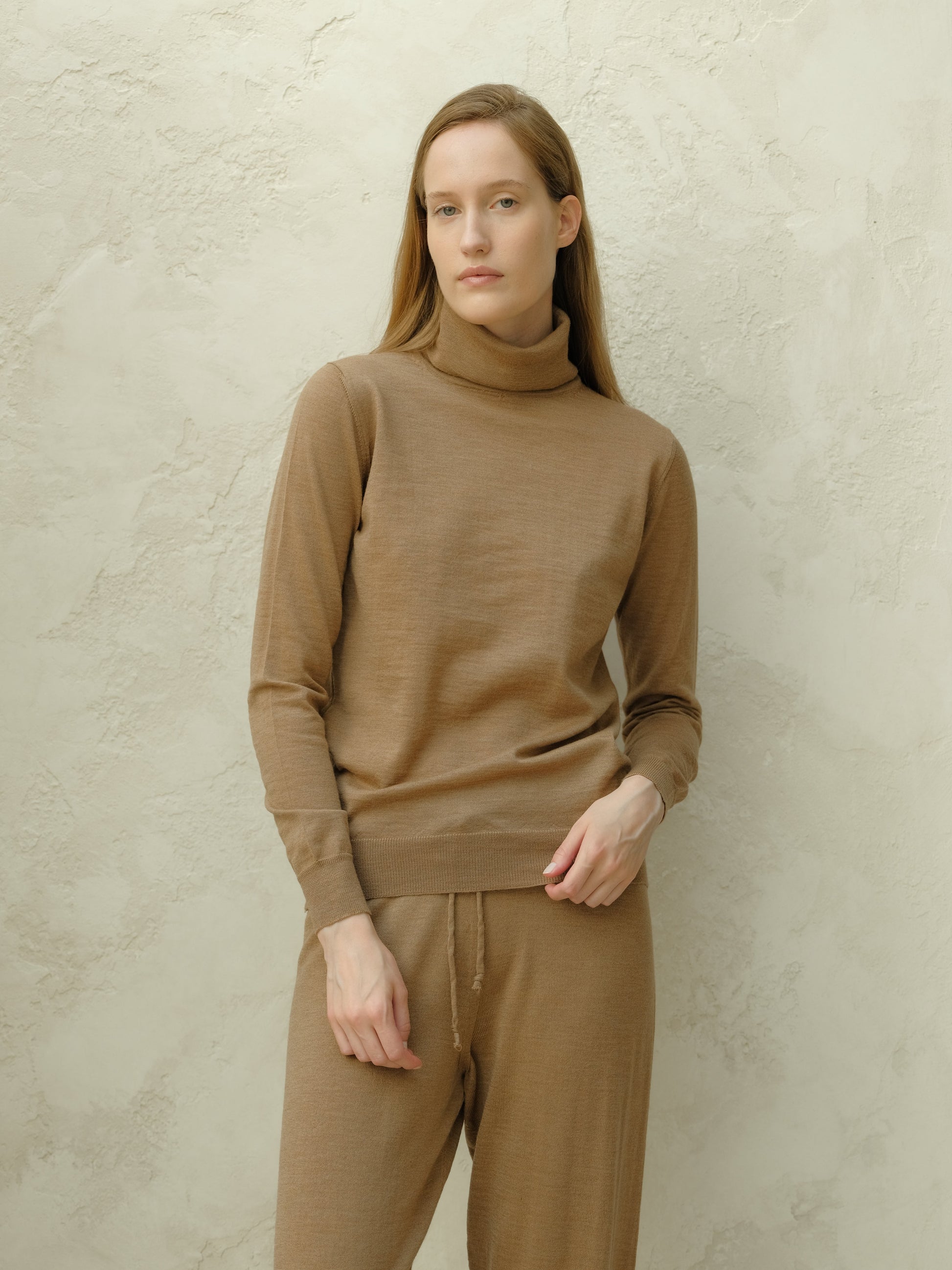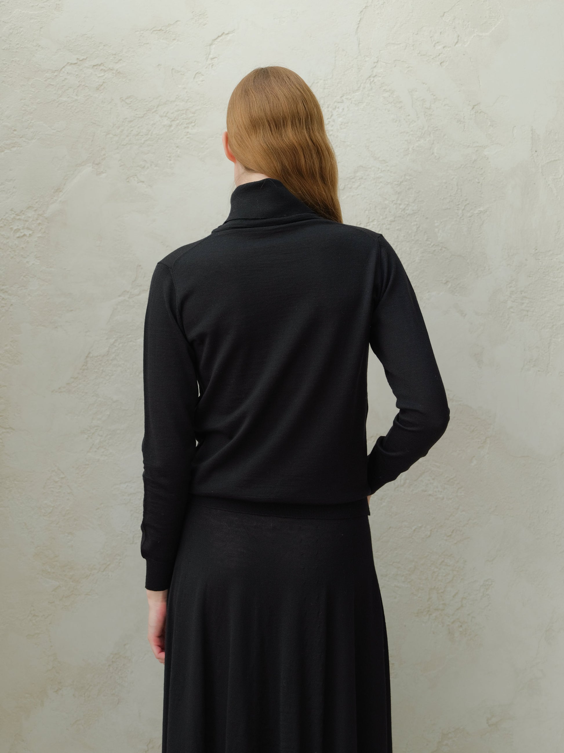 This high-neck sweater is knitted in 100% extrafine merino wool (Cashwool®), offering warmth, breathability, and comfort.