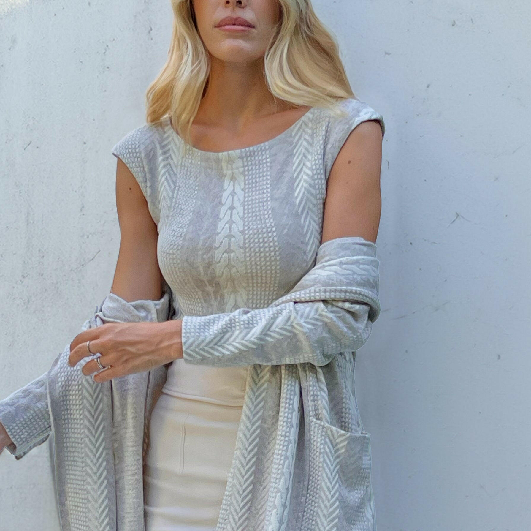 Realizzata in un elegante tessuto jacquard con motivi di trecce, la nostra maglietta Trecce è un capo versatile e raffinato. Il suo scollo a barchetta la rende ideale da indossare sotto una giacca, mentre la possibilità di coordinarla con il cardigan uguale conferisce un tocco di eleganza a ogni outfit.