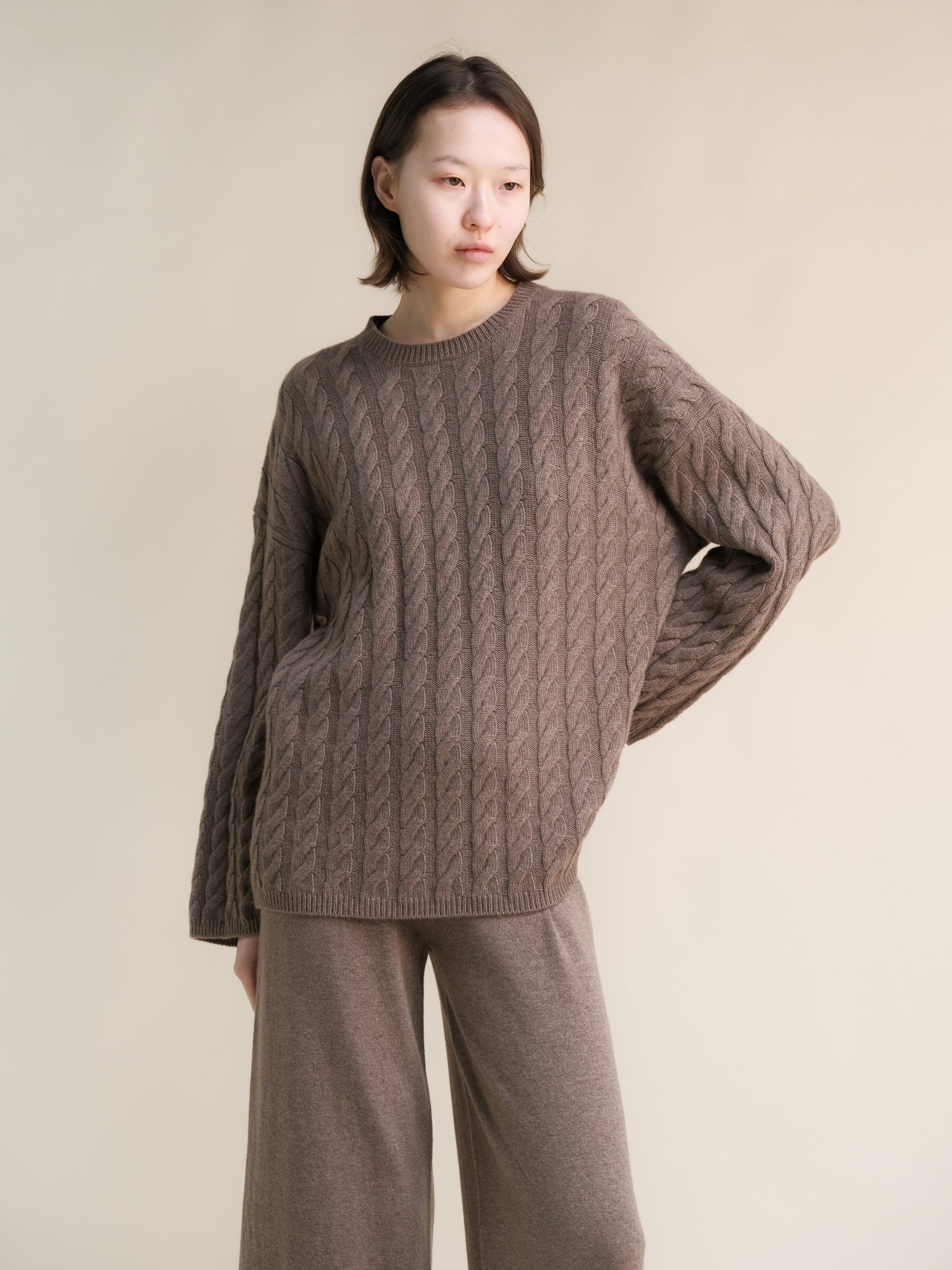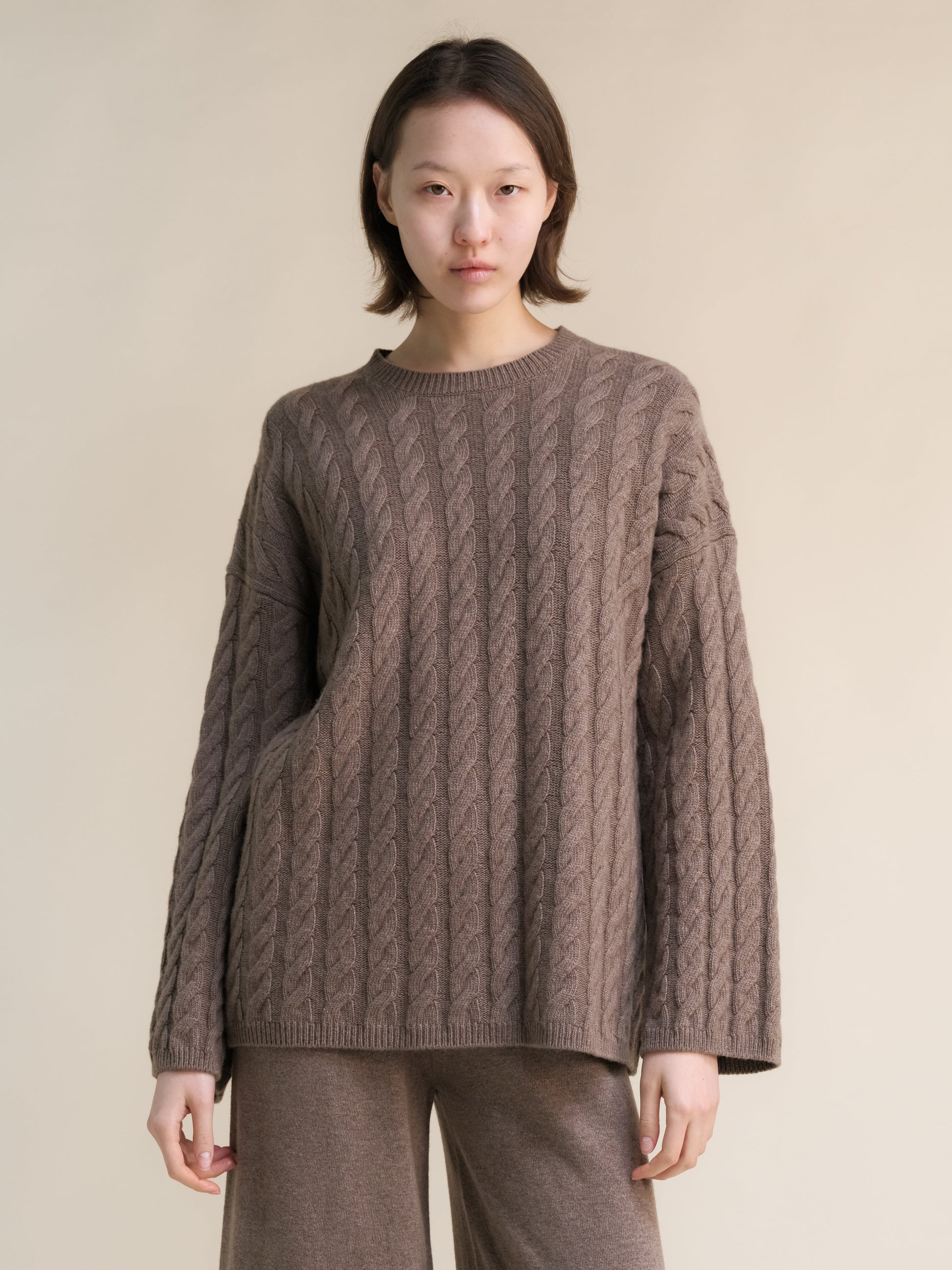 This maxi crewneck sweater is crafted in our soft cashmere mix, featuring a wide fit along the sleeves and flared cuffs for a sculptural silhouette. The cable-knit body adds texture, while ribbed finishes complete the look with balance and warmth.