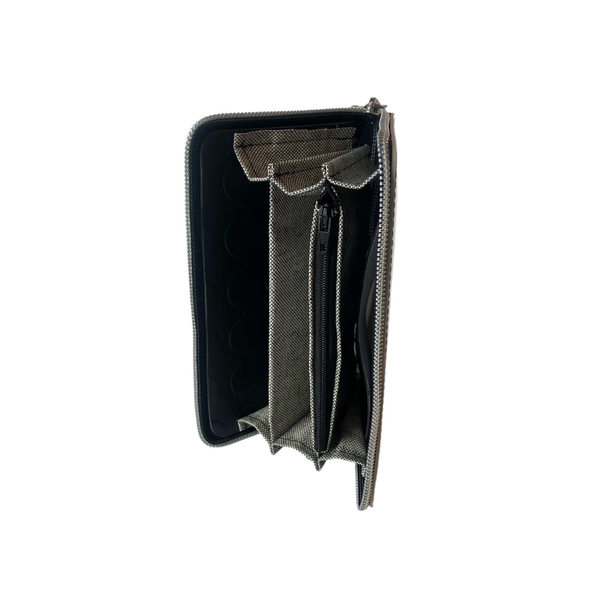 L’interno, in tessuto cerato e pelle artificiale, è progettato per la massima organizzazione: spazi per carte su entrambi i lati, tasca con zip per monete e scomparto centrale per banconote e documenti.